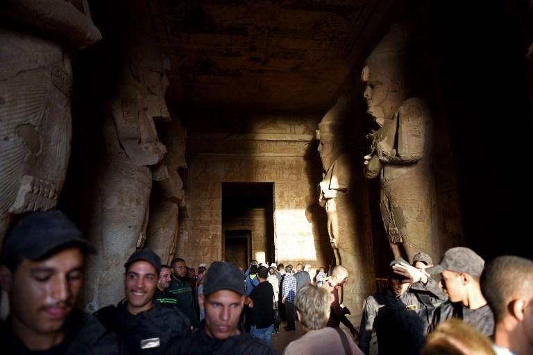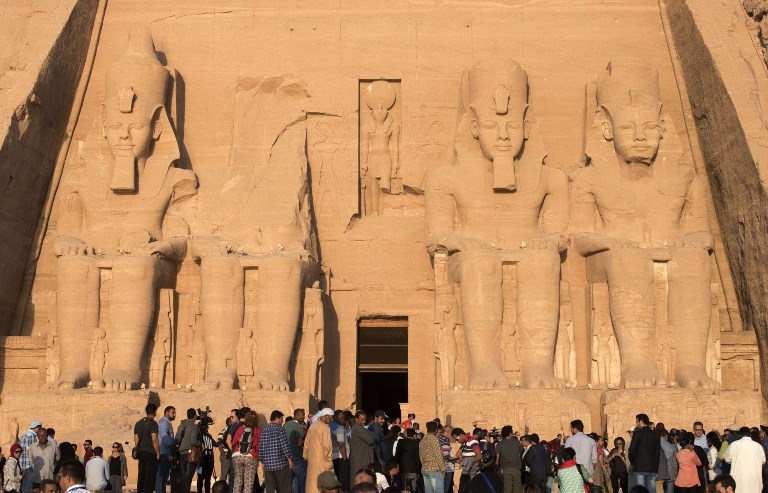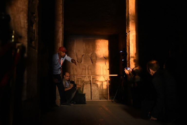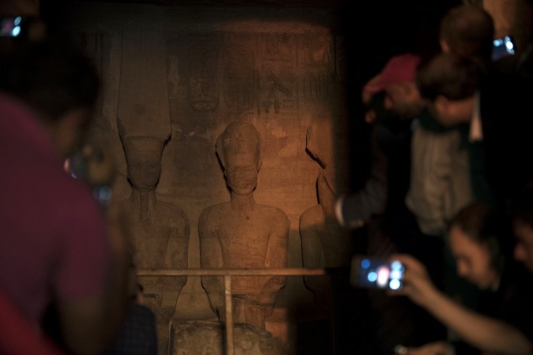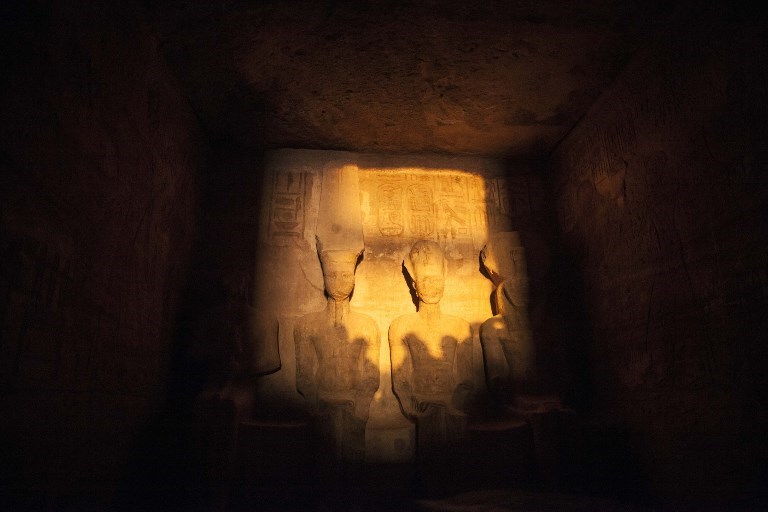 Mısır'ın guneyindeki Asvan kentinde bulunan Ebu Simbel Tapınağı'ndaki Firavun II. Ramses heykeline guneş vurdu.