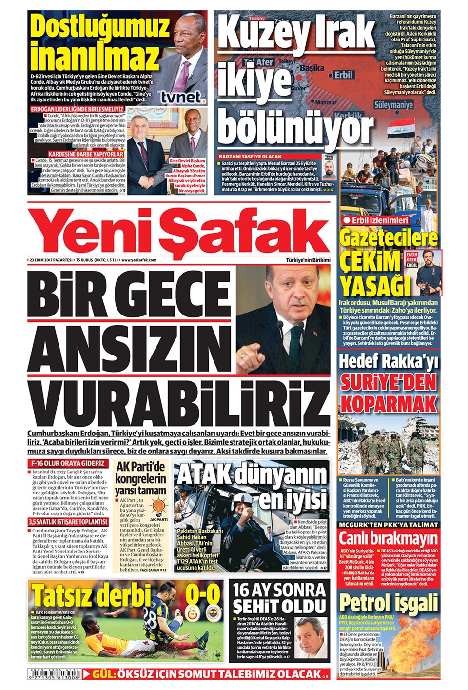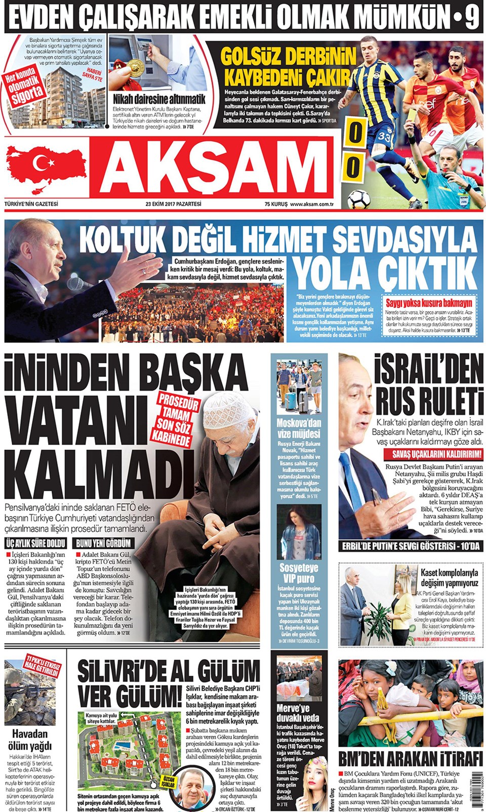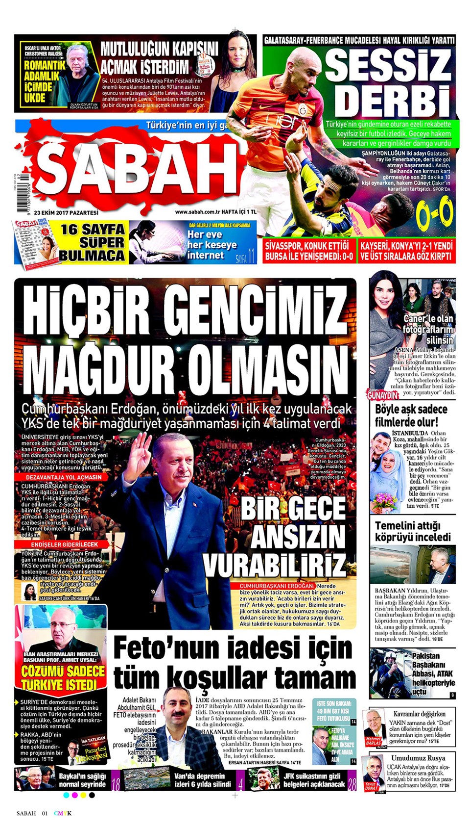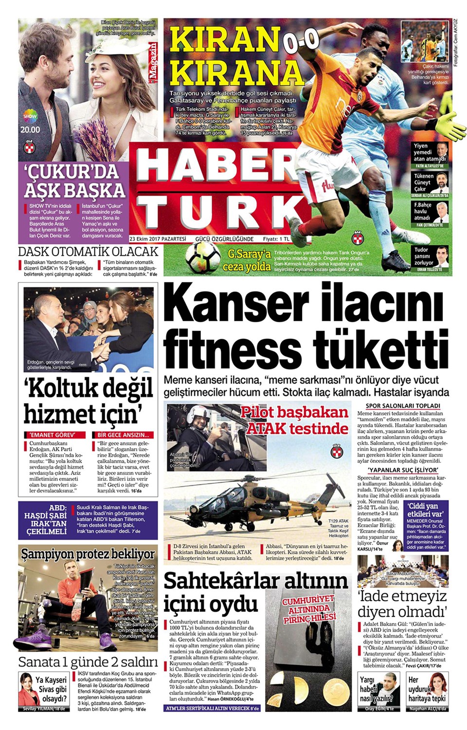 Özet (TL;DR) @ 2017-10-23 10:10:59.112273: “Bugünkü gazete manşetlerinde neler var? Gazeteler Türkiye ve dünya gündemine ilişkin bugün hangi manşetleri attı? Hangi haberler gazete manşetlerinde geniş yer buldu? Gazetelerin birinci sayfalarında…