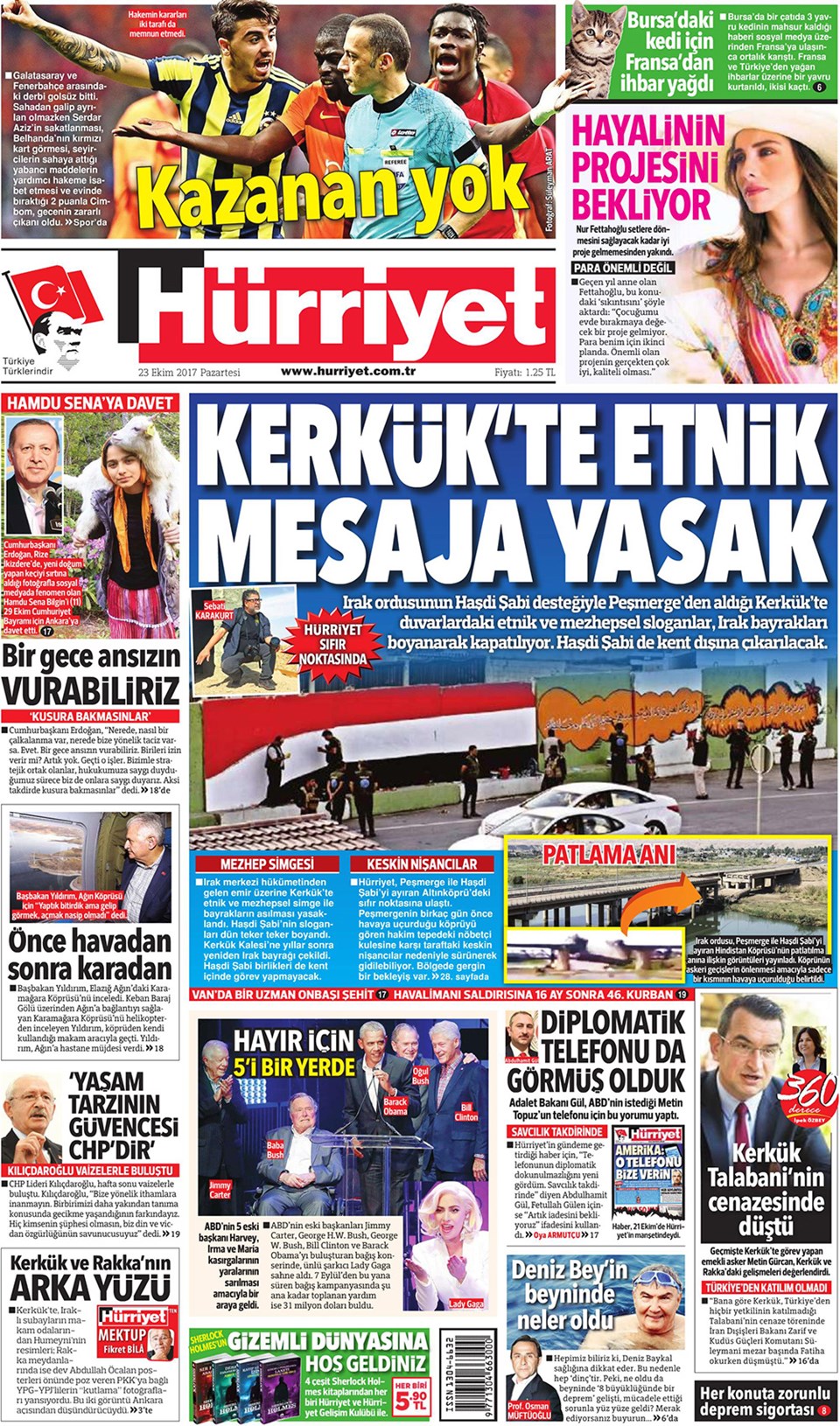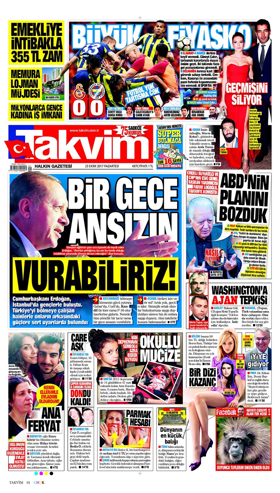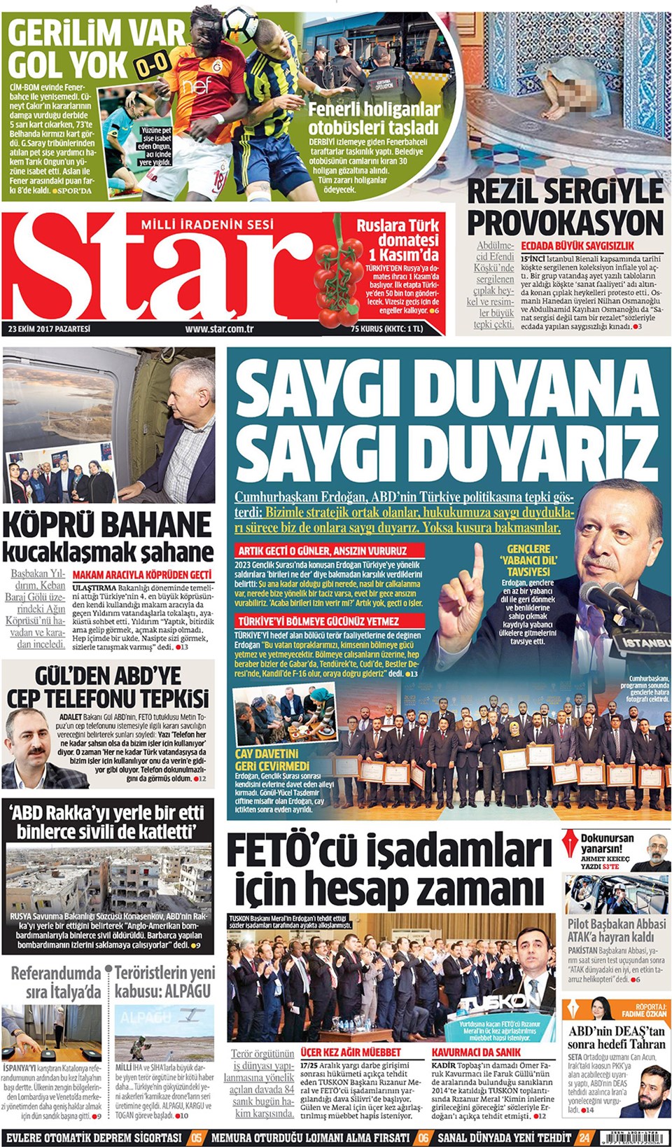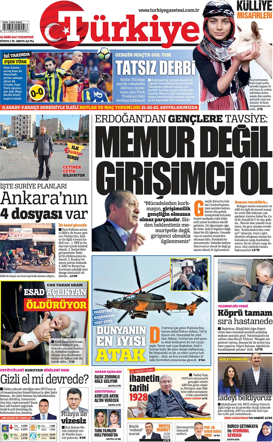 Özet (TL;DR) @ 2017-10-23 10:10:59.112273: “Bugünkü gazete manşetlerinde neler var? Gazeteler Türkiye ve dünya gündemine ilişkin bugün hangi manşetleri attı? Hangi haberler gazete manşetlerinde geniş yer buldu? Gazetelerin birinci sayfalarında…