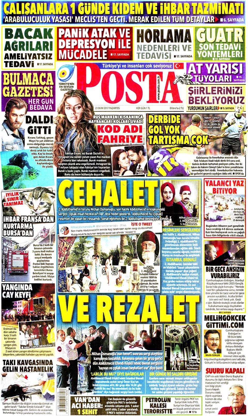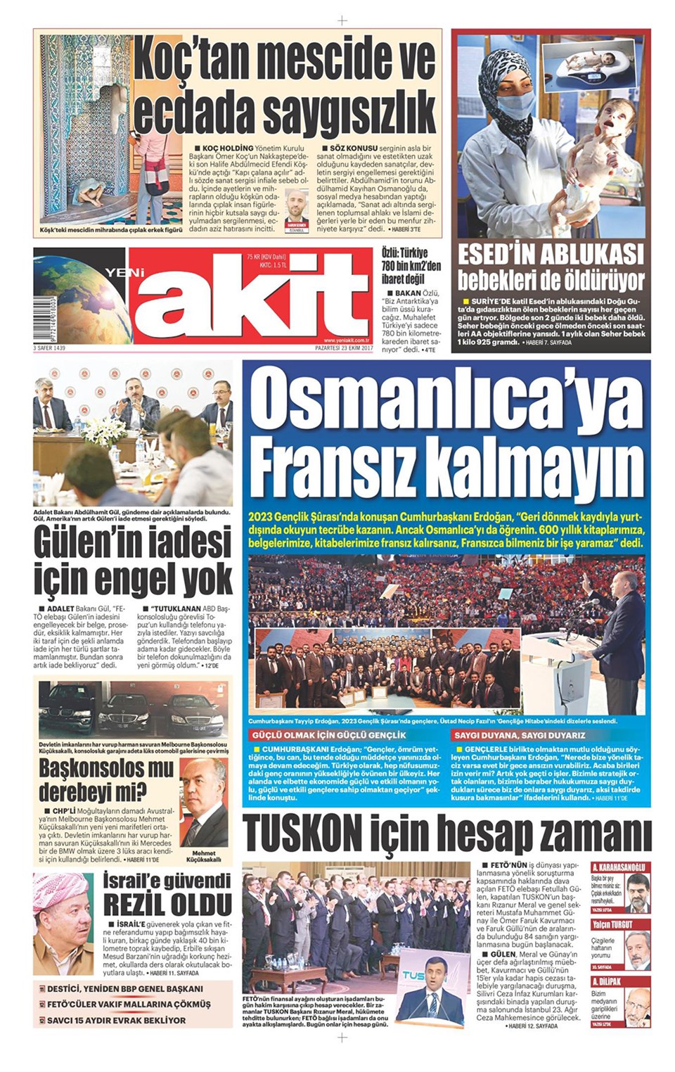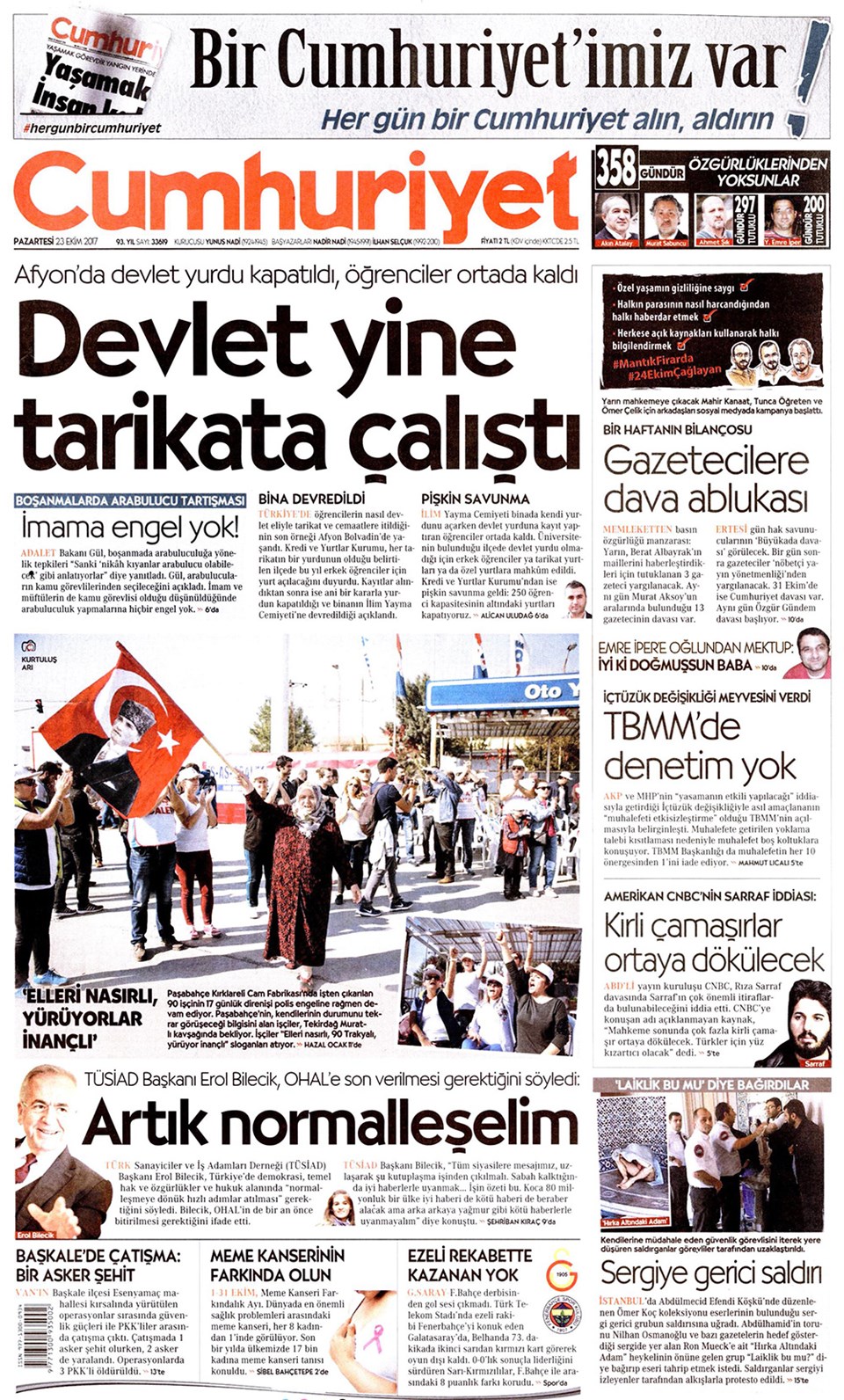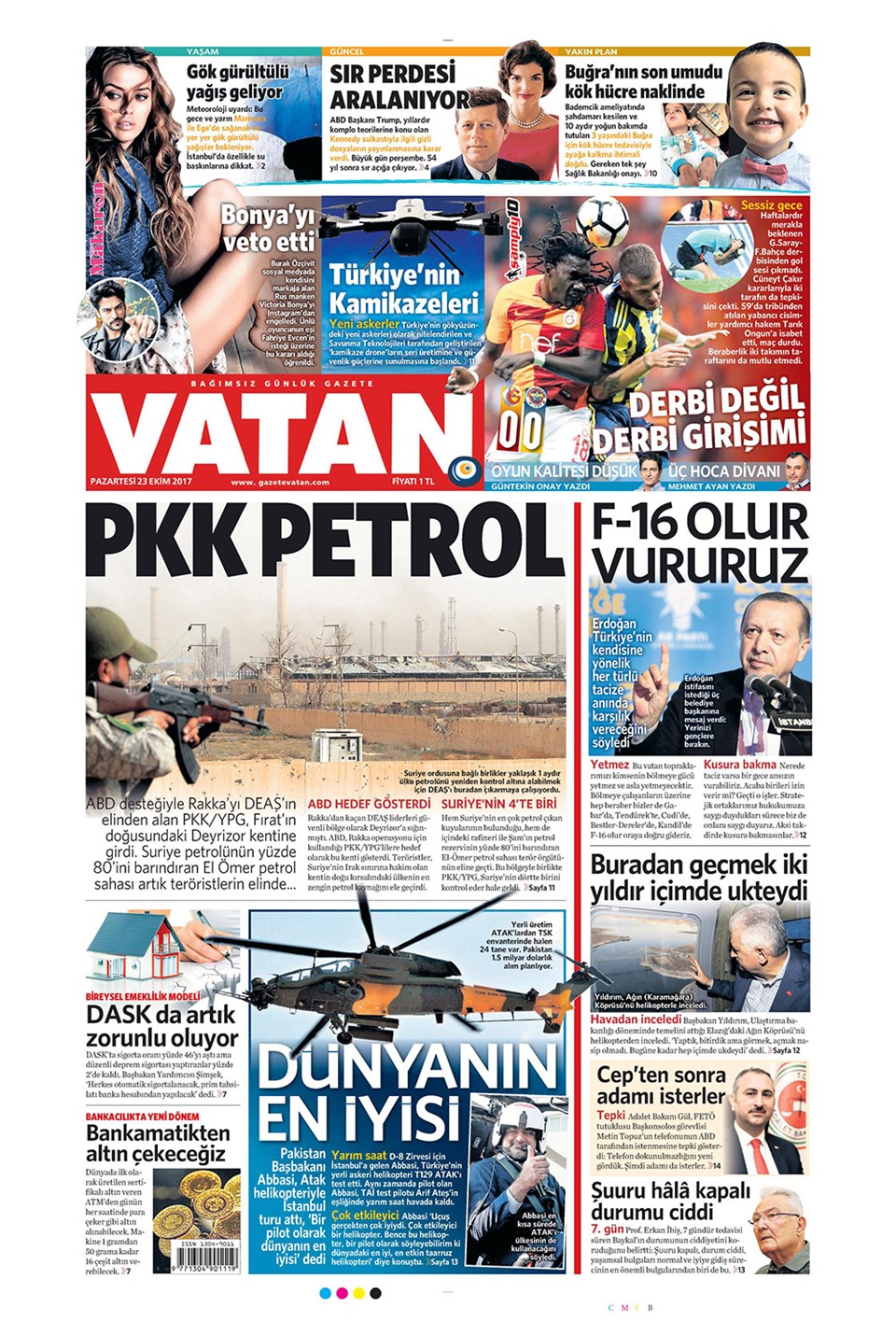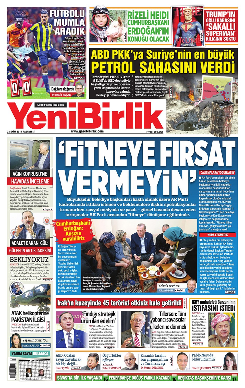 Özet (TL;DR) @ 2017-10-23 10:10:59.112273: “Bugünkü gazete manşetlerinde neler var? Gazeteler Türkiye ve dünya gündemine ilişkin bugün hangi manşetleri attı? Hangi haberler gazete manşetlerinde geniş yer buldu? Gazetelerin birinci sayfalarında…