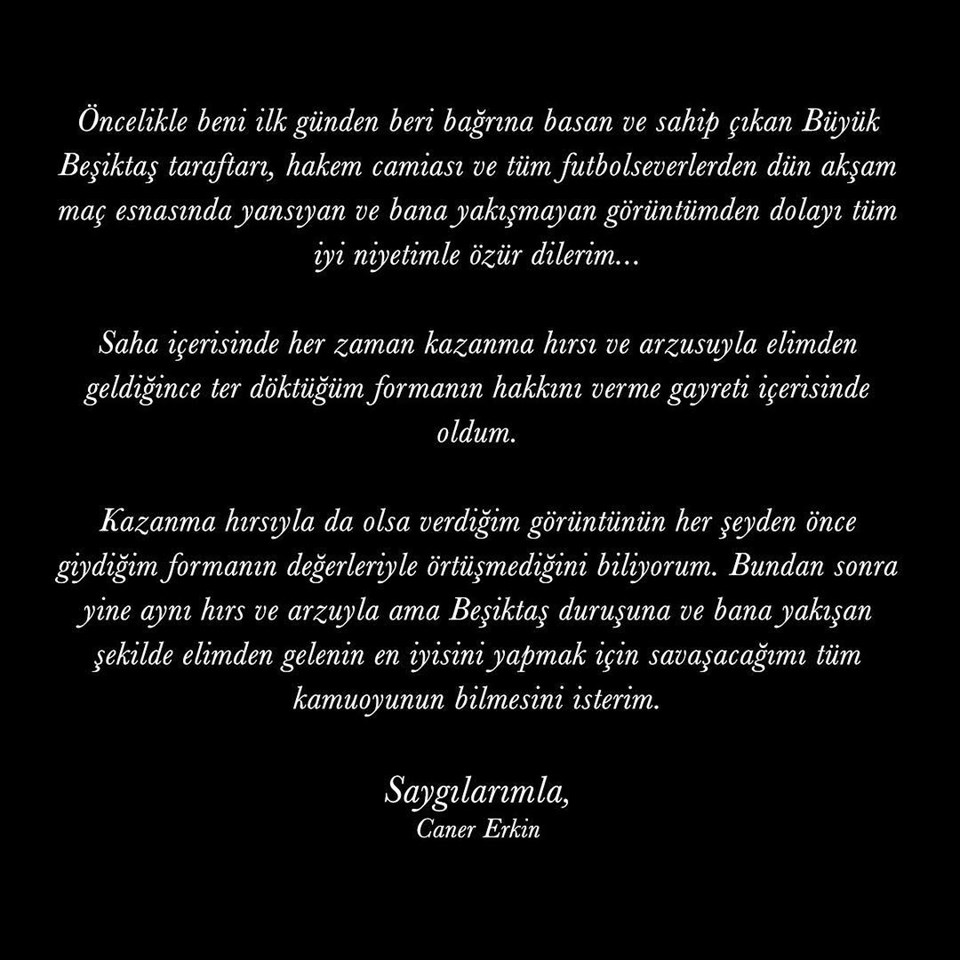 Olay sonra ozur dileyen Erkin ise şu açıklamayı yapmıştı: "Öncelikle beni ilk gunden beri bağrına basan ve sahip çıkan Buyuk Beşiktaş taraftarı, hakem camiası ve tum futbolseverlerden dun akşam maç esnasında yansıyan ve bana yakışmayan goruntumden dolayı tum iyi niyetimle ozur dilerim...Saha içerisinde her zaman kazanma hırsı ve arzusuyla elimden geldiğince ter doktuğum formanın hakkını verme gayreti içerisinde oldum.Kazanma hırsıyla da olsa verdiğim goruntunun her şeyden once giydiğim formanın değerleriyle ortuşmediğini biliyorum. Bundan sonra yine aynı hırs ve arzuyla ama Beşiktaş duruşuna ve bana yakışan şekilde elimden gelenin en iyisini yapmak için savaşacağımı tum kamuoyunun bilmesini isterim.