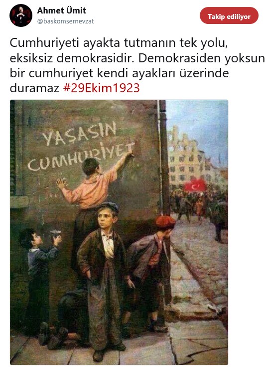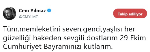 "Tum,memleketini seven,genci,yaşlısı her guzelliği hakeden sevgili dostlarım 29 Ekim Cumhuriyet Bayramınızı kutlarım."
