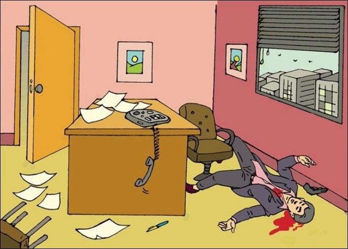 Bu olay cinayet. Ofisteki eşyaların etrafa saçılması bir boğuşma olduğunun gostergesi. Aynı zamanda kurşun yarası intiharların genelinde olduğu gibi adamın başında değil, goğsunde. Son olarak, masadaki telefonun konumundan ve kalemin duştuğu yerden adamın solak olduğunu anlıyoruz ancak silah sağ elinden duşmuş gibi duruyor.