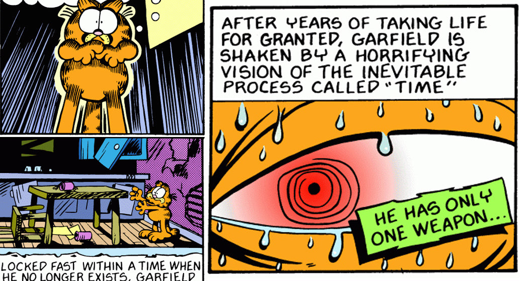Bu, Garfield'ın, çizgi şeridin kendisinin, tüm kurumun doğası hakkında ciddi sorular gündeme getiriyor. Garfield tekrarlayan, mutlu ve kolay mıdır çünkü gerçeklikten bilerek ve amaçlı bir geri çekiliştir? Jim Davis'in varoluşsal korkuyu uzaklaştırma ve acımasız zamanın yıkımlarını dondurma doğrudan ve kasıtlı bir girişimi midir?