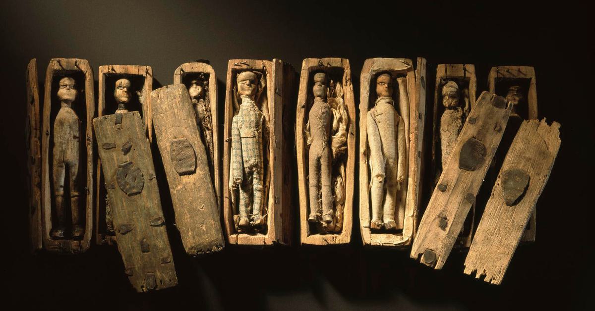 Her tabut (sadece 95 mm uzunluğunda) küçük bir tahta figür içeriyordu. Figürler oyulmuş ve üzerlerine dikilmiş ve yapıştırılmış giysilerle giydirilmişti.